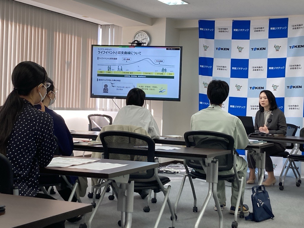 株式会社東建ジオテックの従業員の皆様に「生活設計・家計管理セミナー」「資産形成セミナー」を開催しました。前半は今後のライフイベント表を作成しながら今後のライフプランを考えていただき、後半はライフイベントを叶えるための選択肢として資産形成や投資についてお伝えしました。様々な年代の方々にご参加いただき、ライフイベント表作成のワークにも挑戦してもらいました。終了後には個別質問に来られる方もおられ、非常に熱心に聞いていただきました。今後もお金に関する正しい知識を伝える活動を続けてまいります。