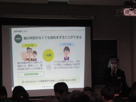 北海道札幌北高等学校にて定時制課程の皆さまを対象に「消費者セミナー」として「ローン・クレジットセミナー」「金融トラブルセミナー」を開催しました。前半では、成年年齢引下げで親の同意がなく契約が可能になる点や、契約に関する基礎知識などクイズを通してお伝えしました。後半では、若者が狙われやすいトラブルとして「フィッシング詐欺」「名義貸し」「アルバイト詐欺」について事例や寸劇を交えて手口や対応策をお話ししました。参加した生徒の皆さまからは「成人になる事で、今まで以上に詐欺などには気を付けようと思った」「成年年齢引き下げで変わるもの、変わらないものを詳しく知ることが出来た」等の感想をいただきました。今後も未来を担う生徒の皆さまに、お金に関する正しい知識を学んでいただけるよう活動を行ってまいります。